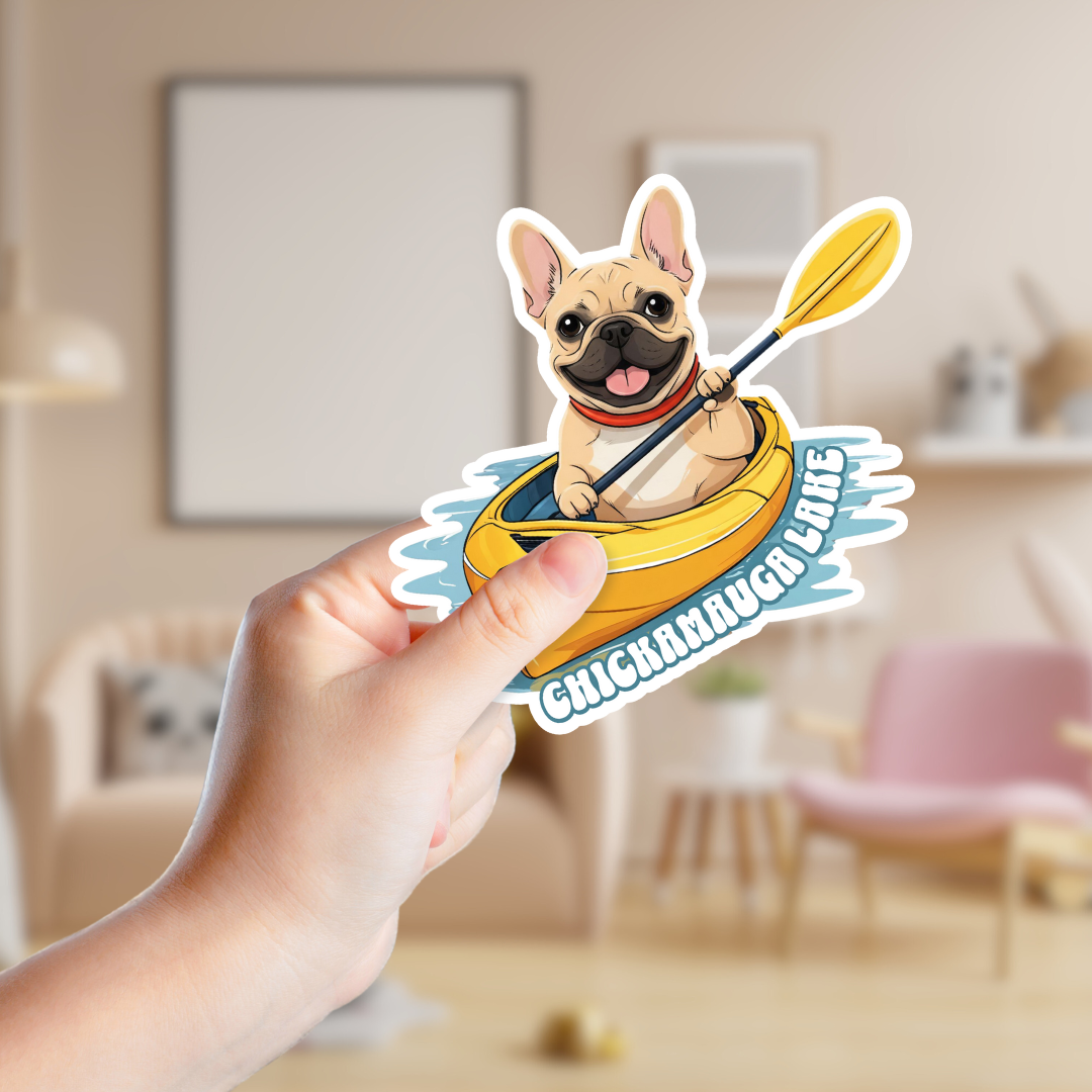 Paddle into adventure with Kayaking French Bulldog, the perfect sticker for all water-loving puppers! Featuring a customizable text and waterproof design, this 2.5x2.5" vinyl sticker is sure to make a splash in any gift shop. (Doggy paddling skills not included.)